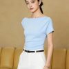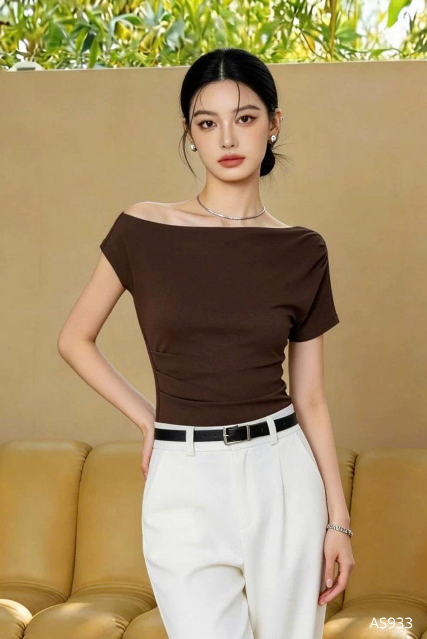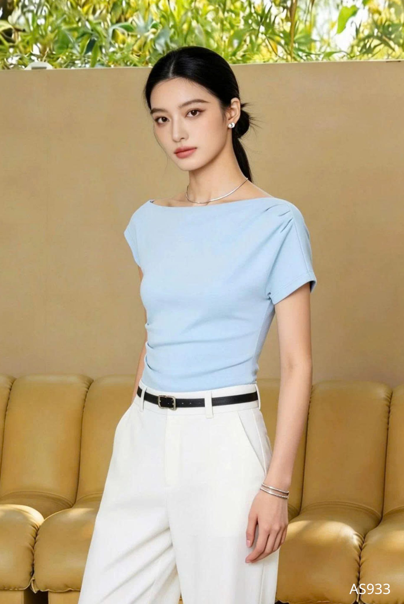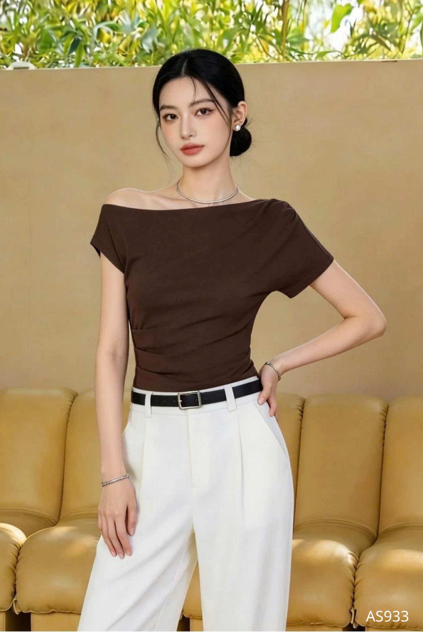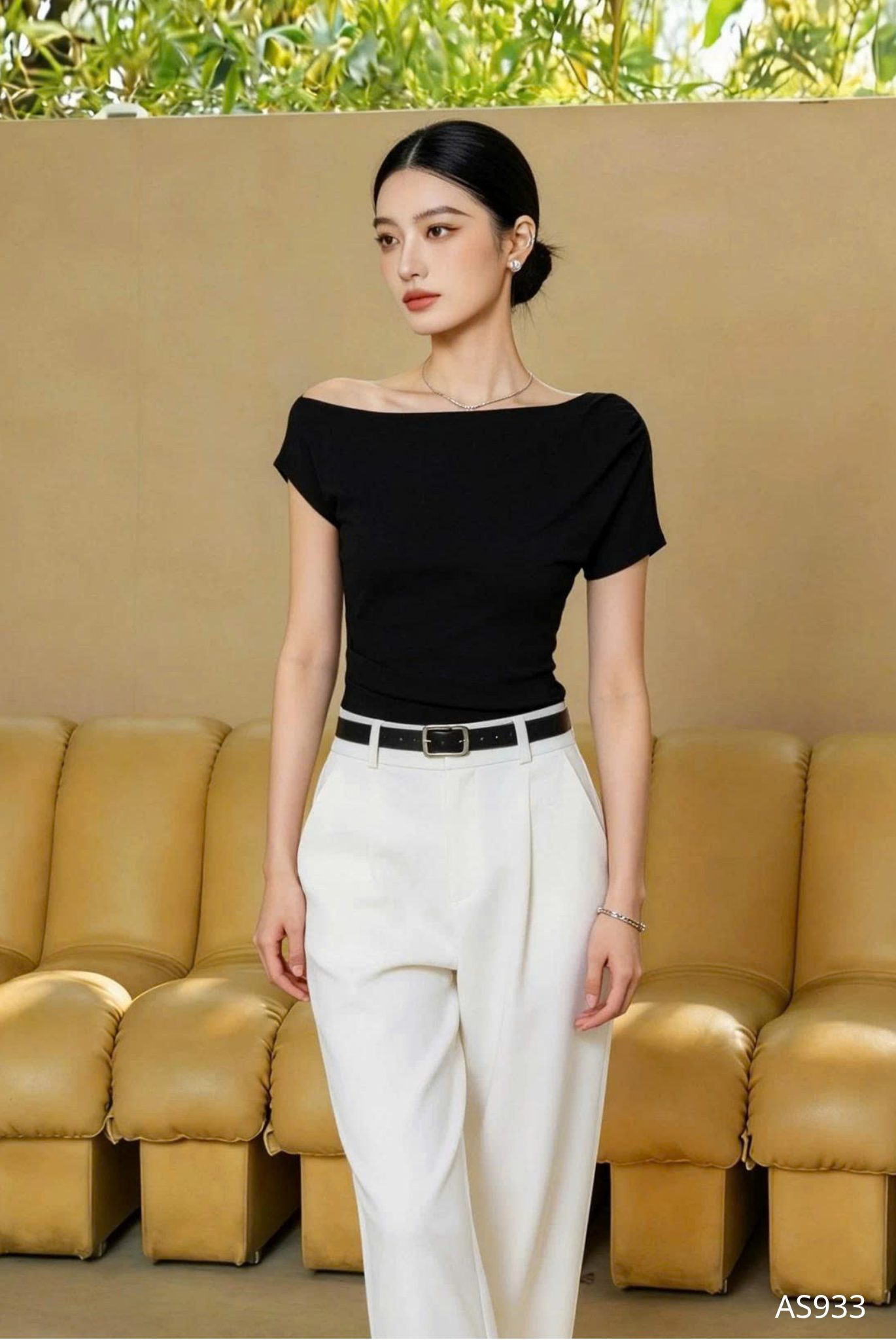 Mẫu áo AS933 được thiết kế theo tinh thần tối giản cao cấp, tôn vinh vẻ đẹp thanh thoát và đường nét cơ thể một cách đầy tinh tế. Phom dáng ôm nhẹ vừa vặn, khéo léo định hình phần thân trên, tạo nên sự cân đối hài hòa giữa bờ vai, vòng eo và tổng thể vóc dáng. Điểm nhấn đặc biệt nằm ở phần cổ lệch vai đầy dụng ý, mang đến cảm giác mềm mại nhưng vẫn giữ được nét hiện đại và thanh lịch, giúp người mặc toát lên thần thái cuốn hút một cách tự nhiên. Kỹ thuật cắt may chuẩn xác cùng những đường hoàn thiện gọn gàng góp phần nâng tầm giá trị thiết kế, tạo nên sự chỉn chu trong từng chi tiết nhỏ.