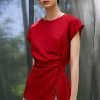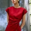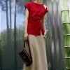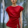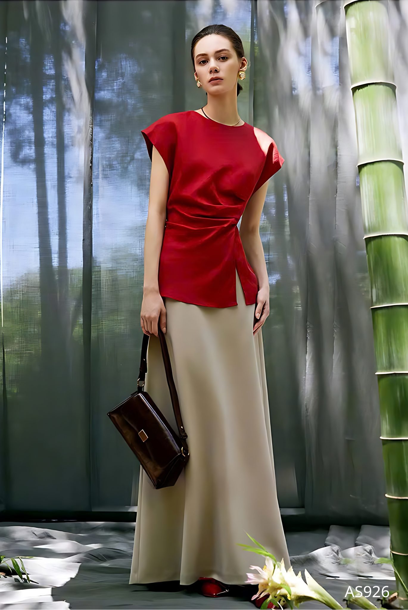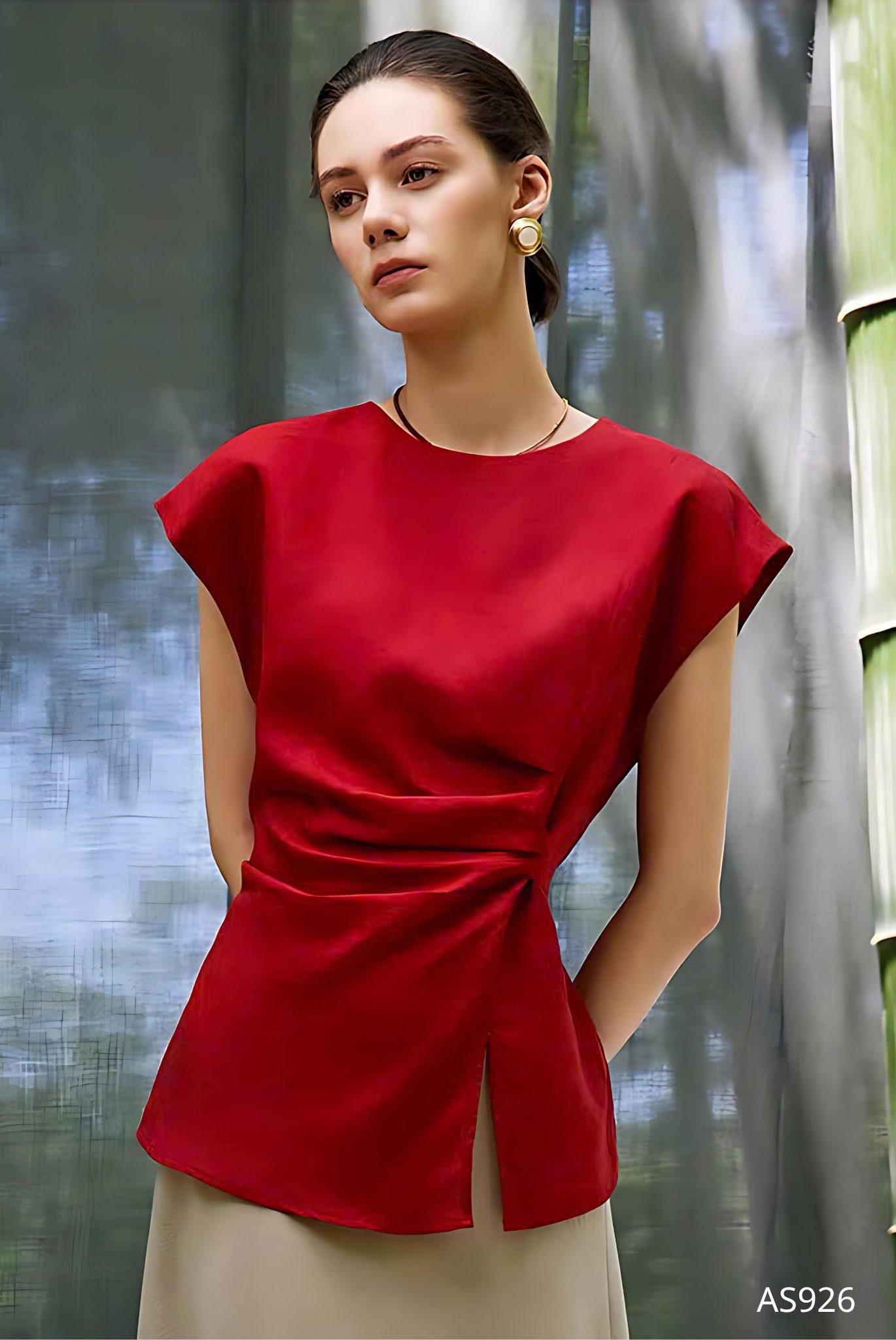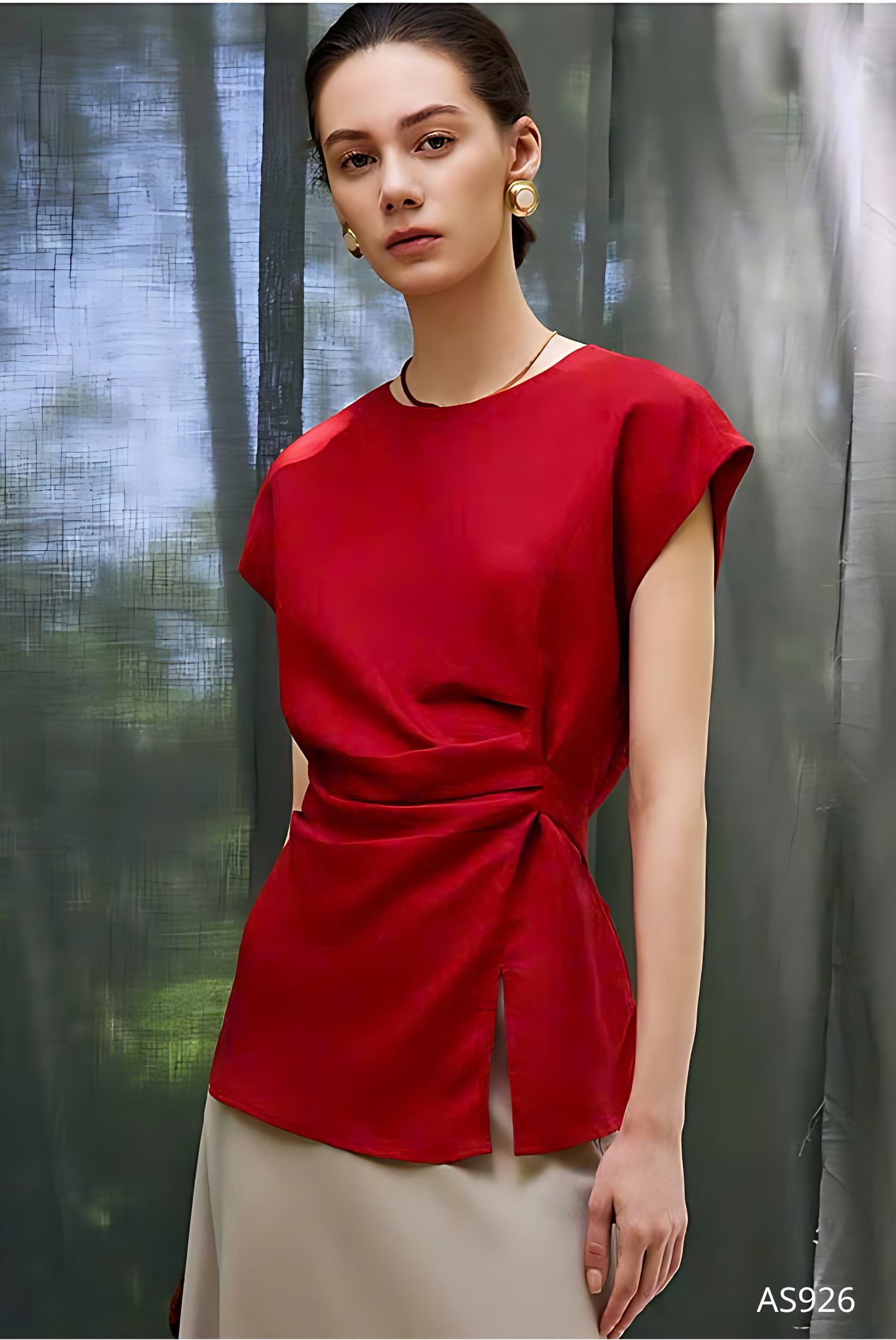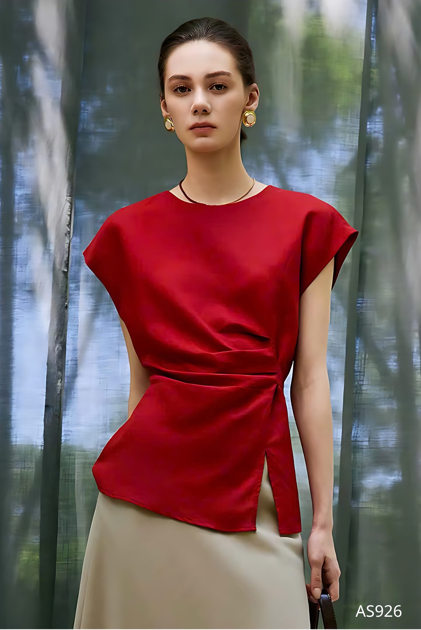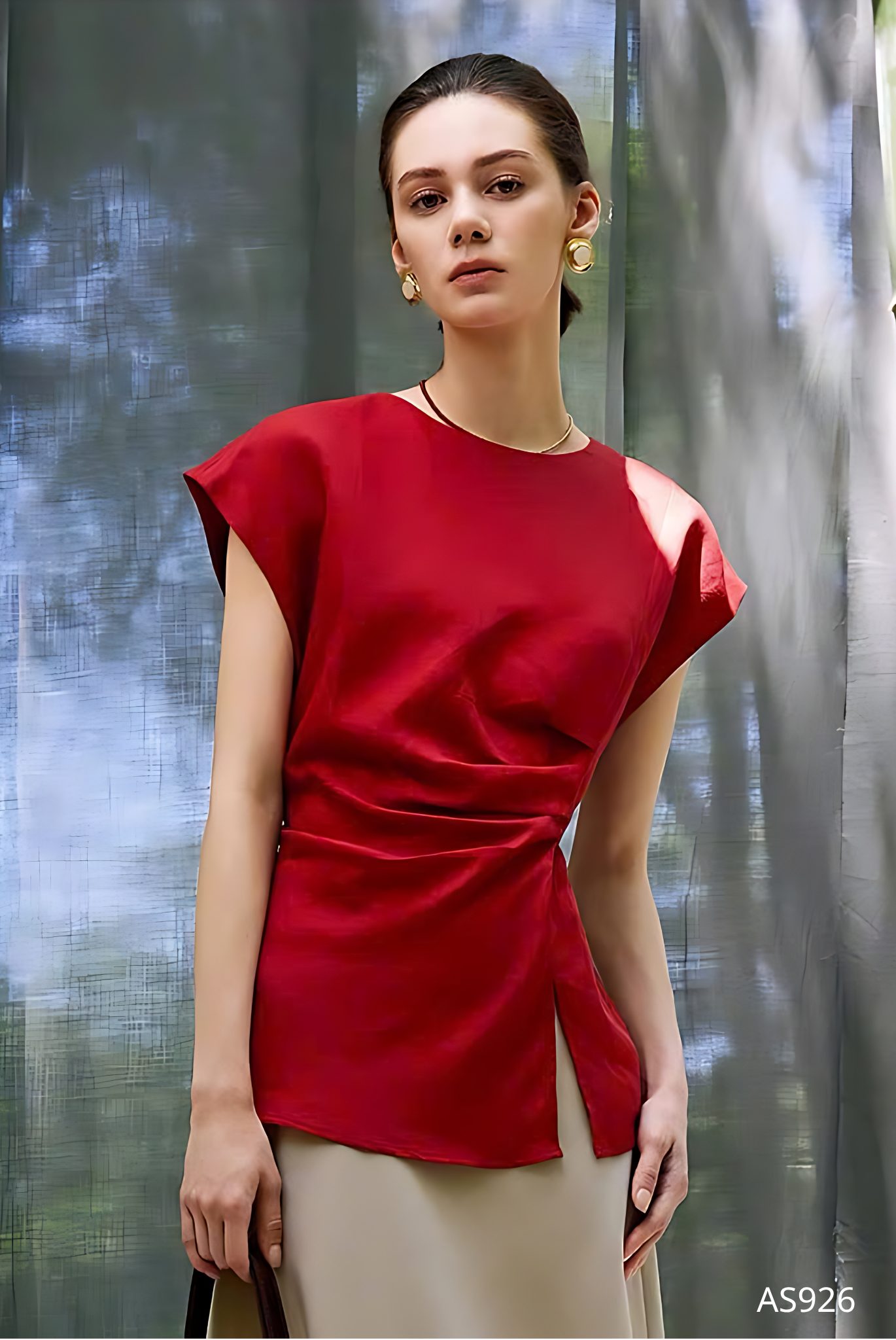 Mẫu áo AS926 gây ấn tượng mạnh mẽ với sắc đỏ thuần khiết mang tinh thần quyền lực và quyến rũ, được thể hiện trên nền chất liệu lụa cao cấp với độ bóng nhẹ tinh tế, tạo hiệu ứng bắt sáng đầy cuốn hút. Phom dáng tối giản nhưng được xử lý khéo léo ở phần eo với kỹ thuật xếp ly mềm mại, giúp tôn lên đường cong một cách kín đáo mà vẫn đầy gợi cảm.