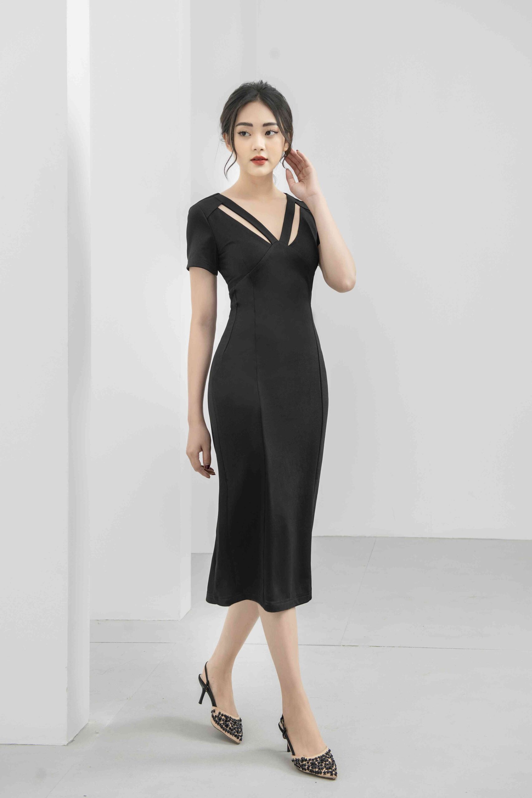 Điểm nhấn cut-out bất đối xứng nơi cổ áo được xử lý đầy nghệ thuật, vừa tạo khoảng hở gợi cảm vừa giữ được sự thanh lịch chuẩn mực, thể hiện ngôn ngữ thiết kế hiện đại nhưng không phô trương. Tay ngắn ôm vai, đường may dọc thân váy được bố cục khoa học giúp định hình silhoutte rõ nét, mang đến vẻ đẹp chỉn chu, tinh tế và đậm chất luxury. Tổng thể thiết kế toát lên phong thái trang nhã, sang trọng và đẳng cấp, phù hợp với hình ảnh người phụ nữ hiện đại: tự tin, tinh giản, thanh lịch và sở hữu gu thẩm mỹ tinh tuyển.