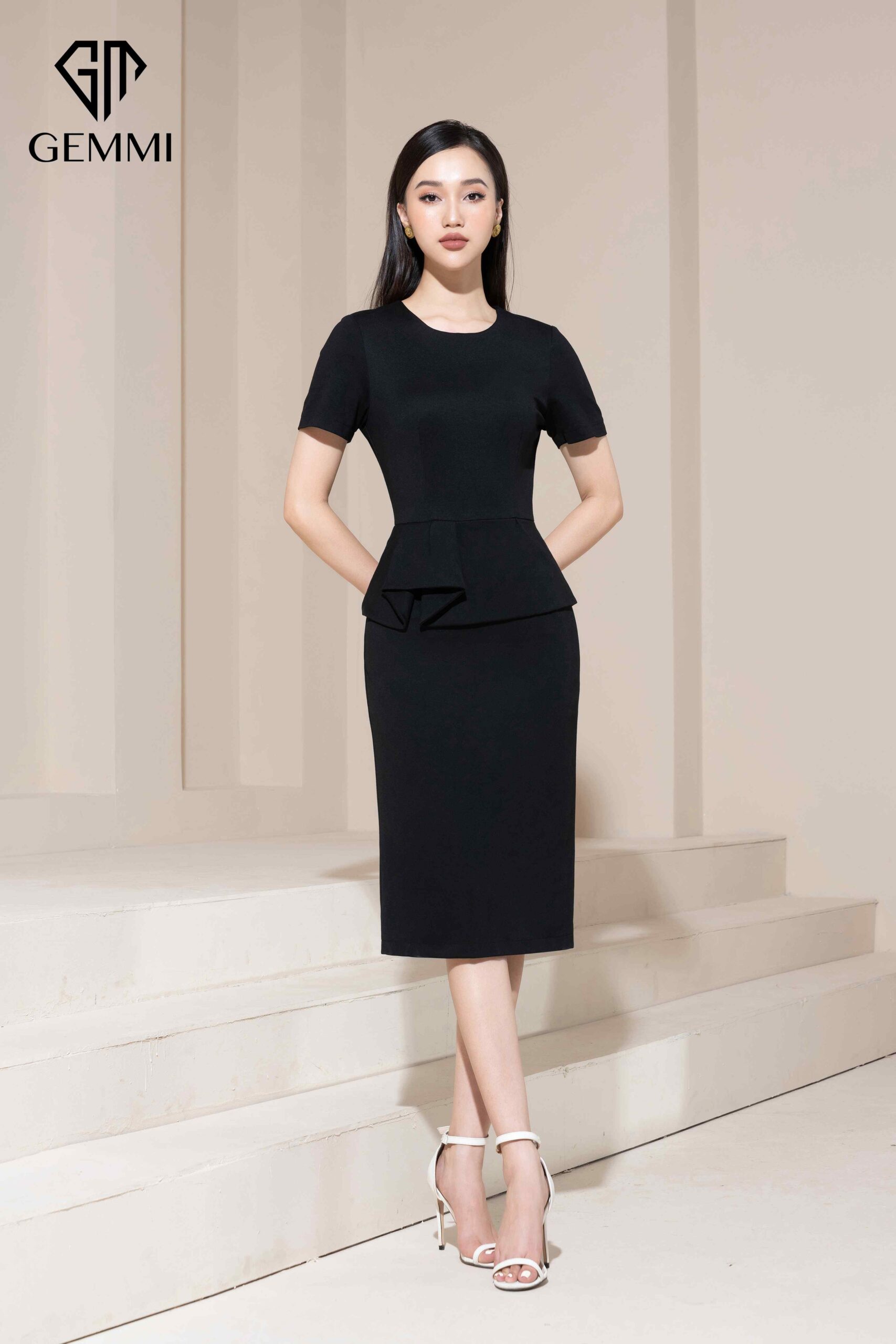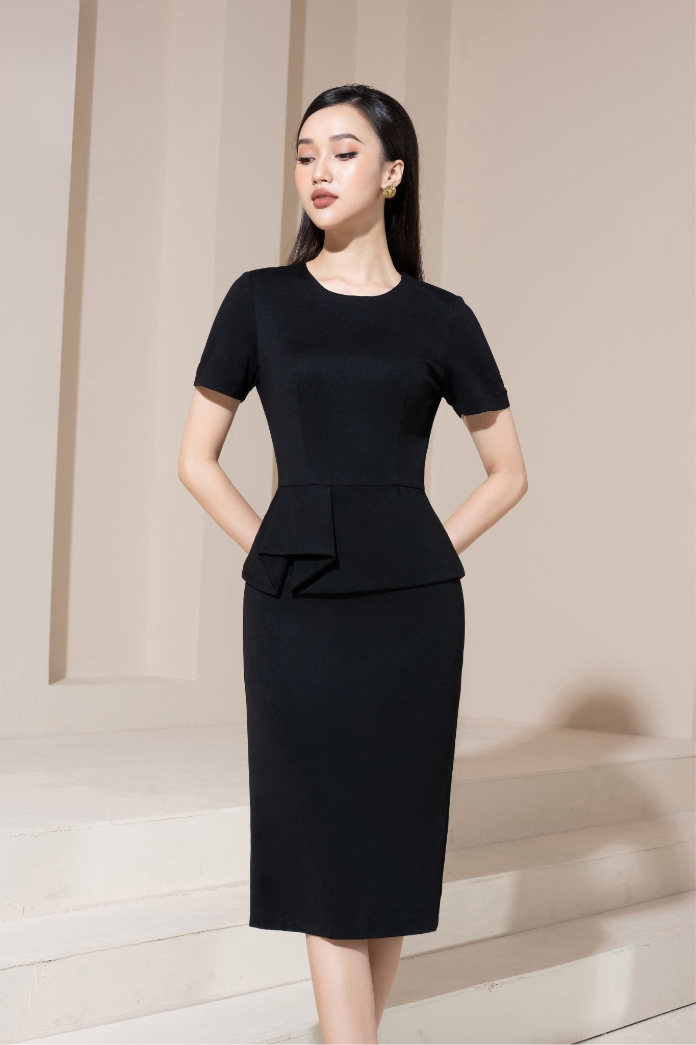 Điểm nhấn peplum xếp lớp nhẹ ở vòng eo được xử lý khéo léo, vừa tạo hiệu ứng vòng eo thon gọn, vừa mang lại chiều sâu thị giác sang trọng và đắt giá cho tổng thể thiết kế. Chất liệu vải đứng phom, bề mặt mịn, sắc đen tuyền sang trọng giúp trang phục giữ được cấu trúc chuẩn form, tôn dáng người mặc và thể hiện rõ tinh thần tối giản cao cấp. Tổng thể mẫu đầm mang vẻ đẹp chuẩn mực của phong cách luxury hiện đại: tinh giản, quyền lực, thanh lịch và đầy khí chất nữ tính.