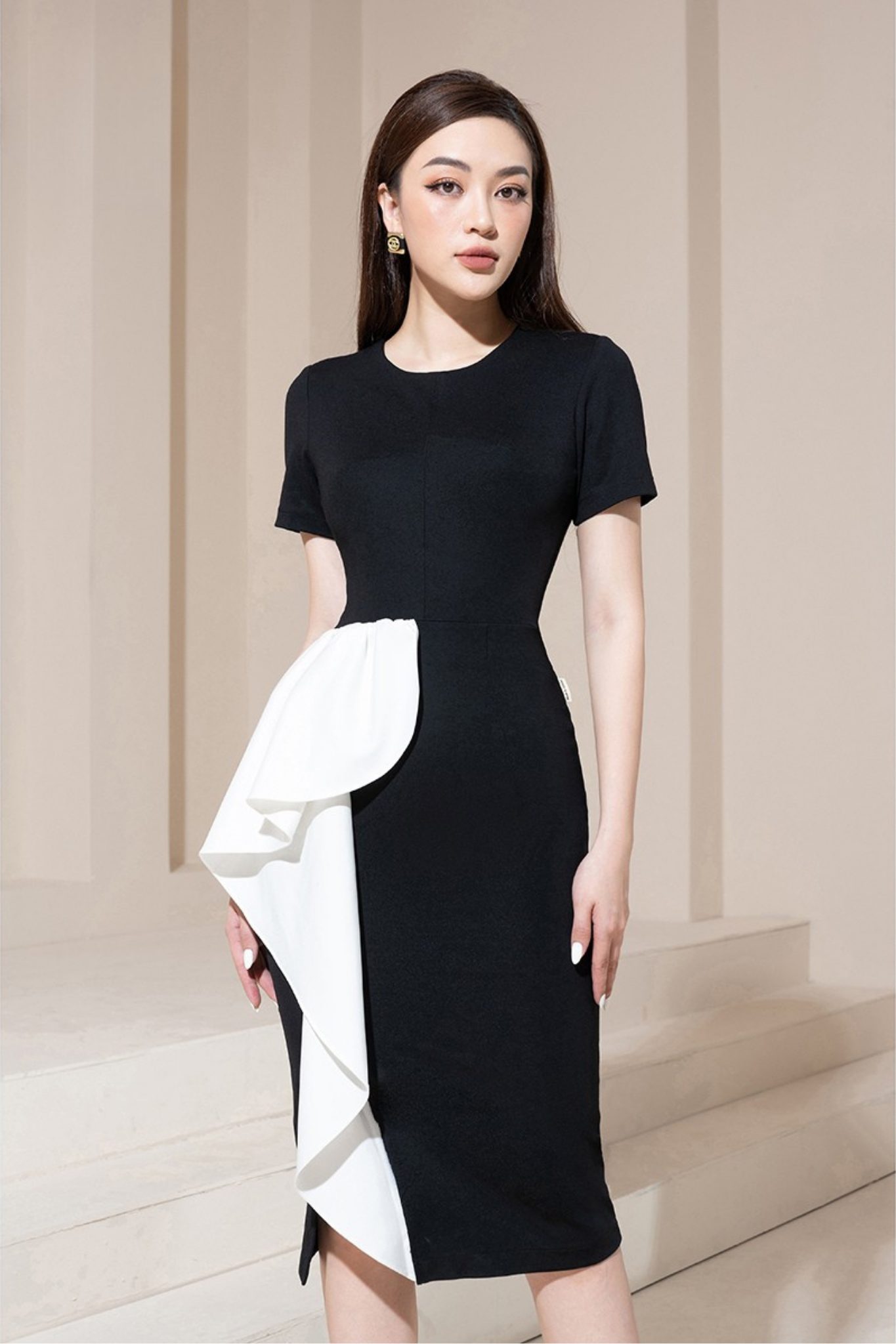 Tổng thể bảng màu đen – trắng thể hiện rõ tinh thần thời trang luxury hiện đại: tối giản trong màu sắc, chuẩn mực trong bố cục, sang trọng trong cảm xúc thị giác và bền vững trong giá trị thẩm mỹ. Thiết kế không chạy theo xu hướng nhất thời mà hướng đến vẻ đẹp kinh điển, giúp người mặc toát lên phong thái thanh lịch, khí chất cao cấp và hình ảnh sang trọng đầy chiều sâu trong mọi không gian xuất hiện.