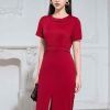 Mẫu đầm DK8495 toát lên vẻ đẹp sang trọng mang tinh thần cổ điển hiện đại, được thể hiện qua phom dáng ôm chuẩn mực, cấu trúc tinh gọn và bảng màu đỏ ruby đầy quyền lực. Thiết kế cổ tròn thanh lịch kết hợp tay ngắn chuẩn mực tạo nên diện mạo trang nhã, nền nếp và tinh tế, phù hợp với tinh thần thời trang cao cấp bền vững. Điểm nhấn đường line đen mảnh tinh xảo chạy viền cổ và eo giúp định hình phom dáng rõ nét, tạo hiệu ứng thắt eo tinh gọn và làm nổi bật đường cong cơ thể một cách kín đáo, sang trọng.
