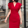 Mẫu đầm gây ấn tượng với sắc đỏ rượu vang quyền lực, tôn lên vẻ đẹp kiêu sa và thần thái tự tin của người mặc. Thiết kế cổ V xếp chéo tinh tế khéo léo tôn vòng cổ và đường nét thanh tú, kết hợp phần vai dựng nhẹ tạo phom dáng sang trọng, hiện đại. Phom đầm ôm vừa vặn, đường cắt gọn gàng giúp tôn lên đường cong cơ thể một cách kín đáo mà cuốn hút, phù hợp cho môi trường công sở cao cấp hoặc những buổi gặp gỡ trang trọng. Chất liệu vải đứng phom, bề mặt mịn màng mang lại cảm giác chỉn chu và đẳng cấp, khiến tổng thể thiết kế trở thành lựa chọn hoàn hảo cho quý cô yêu phong cách thanh lịch nhưng vẫn đầy bản lĩnh.