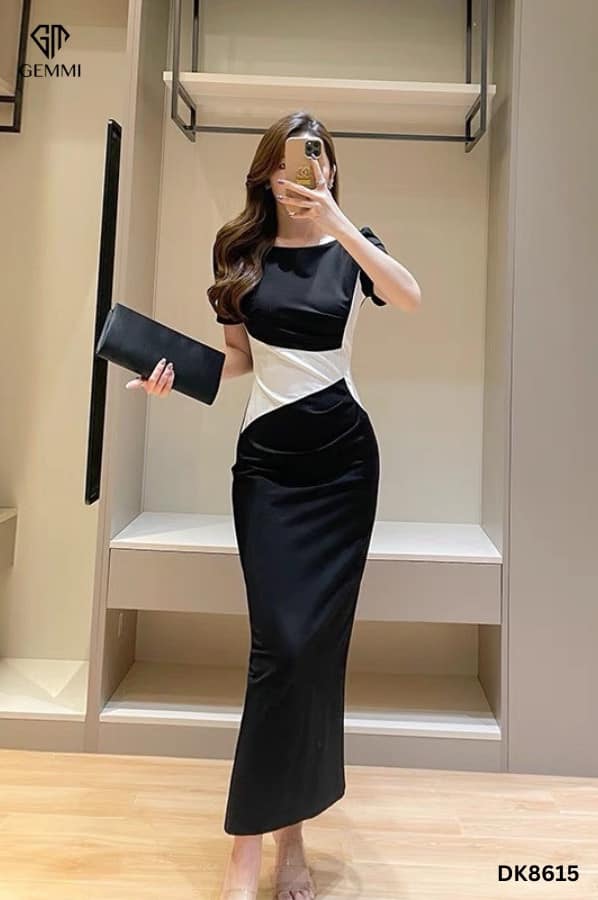 Mẫu đầm trong hình gây ấn tượng mạnh mẽ ngay từ cái nhìn đầu tiên nhờ nghệ thuật phối màu đầy dụng ý, mang đến hiệu ứng thị giác tinh tế và sang trọng. Sắc đỏ và trắng quyến rũ được tiết chế vừa đủ, kết hợp cùng gam đen kinh điển tạo nên tổng thể hài hòa, nổi bật khí chất tự tin của người mặc. Điểm nhấn đắt giá nằm ở mảng màu đen được xử lý khéo léo tại vòng eo, kết hợp cùng các đường cắt chéo mềm mại, giúp thu gọn phần thân giữa một cách tự nhiên. Thiết kế này không chỉ tạo cảm giác vòng eo thon gọn mà còn khéo léo kéo dài tỷ lệ cơ thể, mang lại vóc dáng cân đối và thanh thoát.