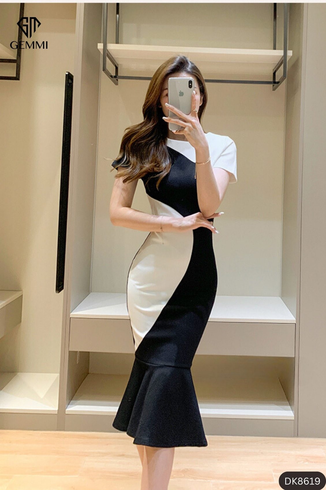 Mẫu đầm DK8619 mang phong cách bodycon dáng đuôi cá sang trọng và cực kỳ tôn dáng. Đầm được thiết kế ôm sát cơ thể với phối màu đen – trắng tương phản tinh tế, tạo hiệu ứng thị giác giúp vòng eo trông thon gọn và đường cong nổi bật hơn. Phần thân trên là tay ngắn, cổ tròn cao vừa phải, mang lại cảm giác thanh lịch và hiện đại. Các mảng màu được cắt may khéo léo, uốn lượn theo đường cơ thể, làm nổi bật vòng eo và hông. Phần chân váy xòe nhẹ kiểu đuôi cá giúp tổng thể mềm mại, nữ tính nhưng vẫn rất quyến rũ khi di chuyển. Chất liệu vải có độ đứng form tốt, bề mặt mịn, phù hợp cho các buổi tiệc, sự kiện hoặc những dịp cần vẻ ngoài chỉn chu và đẳng cấp.