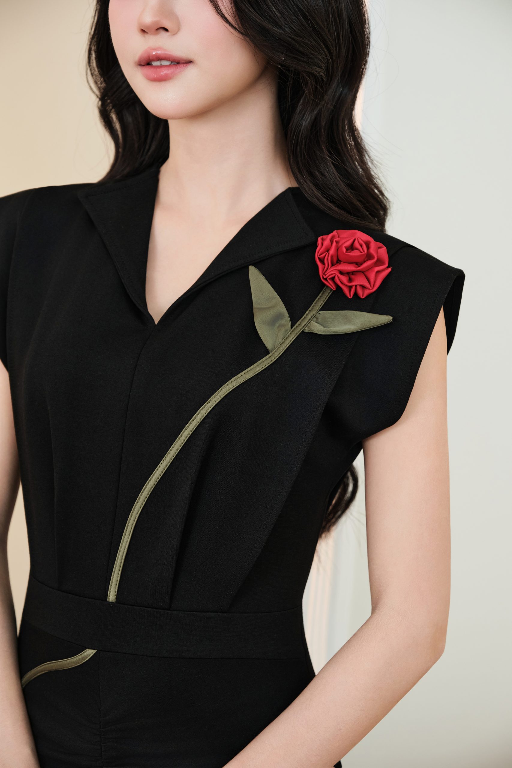 Bông hoa đỏ được đặt khéo léo trên thân váy như một điểm nhấn nghệ thuật đầy dụng ý, nổi bật trên nền sắc đen sang trọng, tạo nên sự tương phản tinh tế và cuốn hút ngay từ ánh nhìn đầu tiên. Đường thân lá uốn lượn mềm mại chạy dọc theo phom dáng không chỉ tạo hiệu ứng thị giác uyển chuyển mà còn dẫn dắt ánh nhìn một cách tự nhiên, giúp tổng thể thiết kế trở nên hài hòa, sống động và giàu chiều sâu thẩm mỹ.