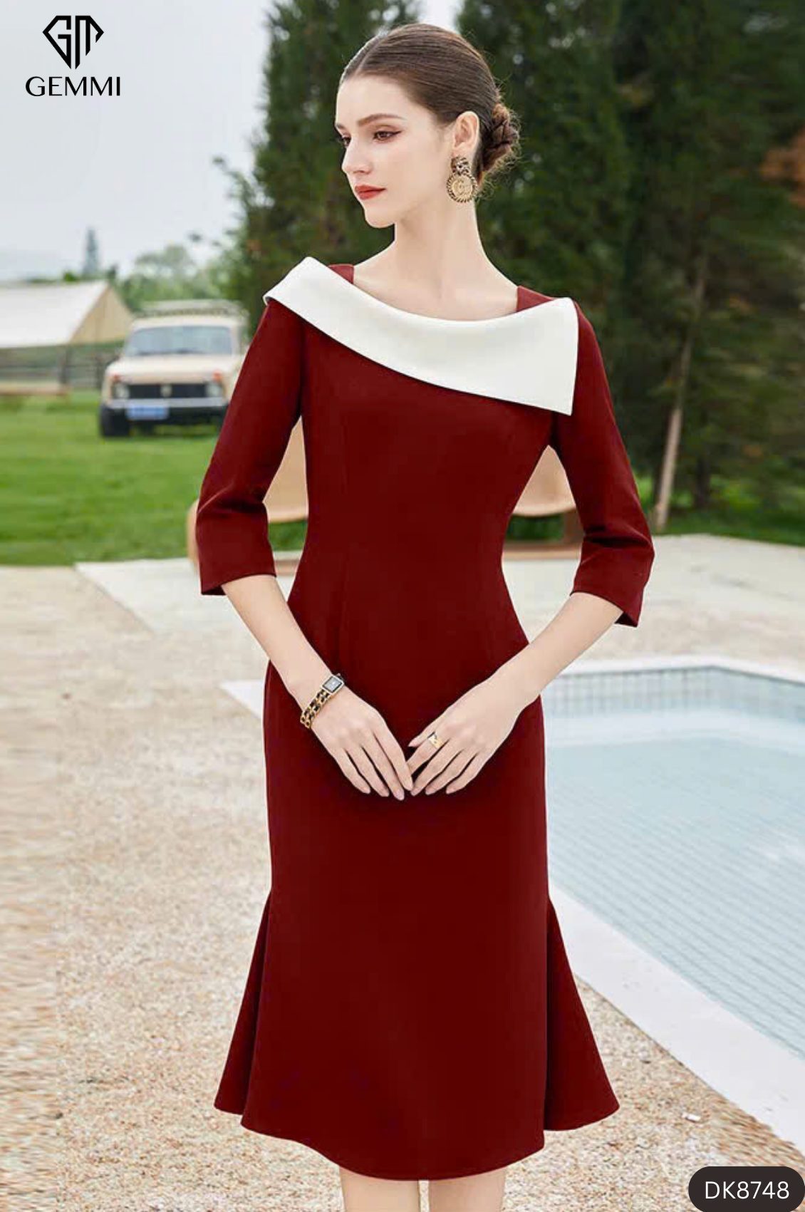 Chi tiết cổ lệch phối màu được thiết kế như một điểm nhấn thị giác cao cấp, vừa tạo chiều sâu cho tổng thể trang phục, vừa thể hiện gu thẩm mỹ tinh tế và đẳng cấp của người mặc. Sự kết hợp hài hòa giữa phom dáng, chất liệu và bố cục thiết kế mang đến thần thái sang trọng, quý phái và phong thái tự tin rất riêng, không phô trương nhưng đầy cuốn hút. Mẫu đầm không chỉ là một thiết kế thời trang, mà còn là tuyên ngôn phong cách dành cho những quý cô theo đuổi vẻ đẹp thanh lịch, tinh tế và chuẩn mực. Đây là lựa chọn lý tưởng cho hình ảnh người phụ nữ hiện đại, đẳng cấp, giàu khí chất và hướng đến giá trị thẩm mỹ bền vững trong phong cách thời trang cao cấp.