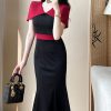 Thiết kế là sự hòa quyện tinh tế giữa phom dáng midi ôm dài thanh lịch, cấu trúc phối màu đen – đỏ đầy khí chất, chi tiết chiết eo chuẩn mực và thiết kế cổ chữ v xếp lớp được xử lý tinh xảo, mang đậm tinh thần thẩm mỹ cao cấp. Tổng thể form dáng được xây dựng theo trục dọc cơ thể, giúp tạo hiệu ứng thị giác thon gọn, cao ráo, đồng thời định hình đường cong mềm mại một cách tự nhiên, không gò bó, không phô trương.
