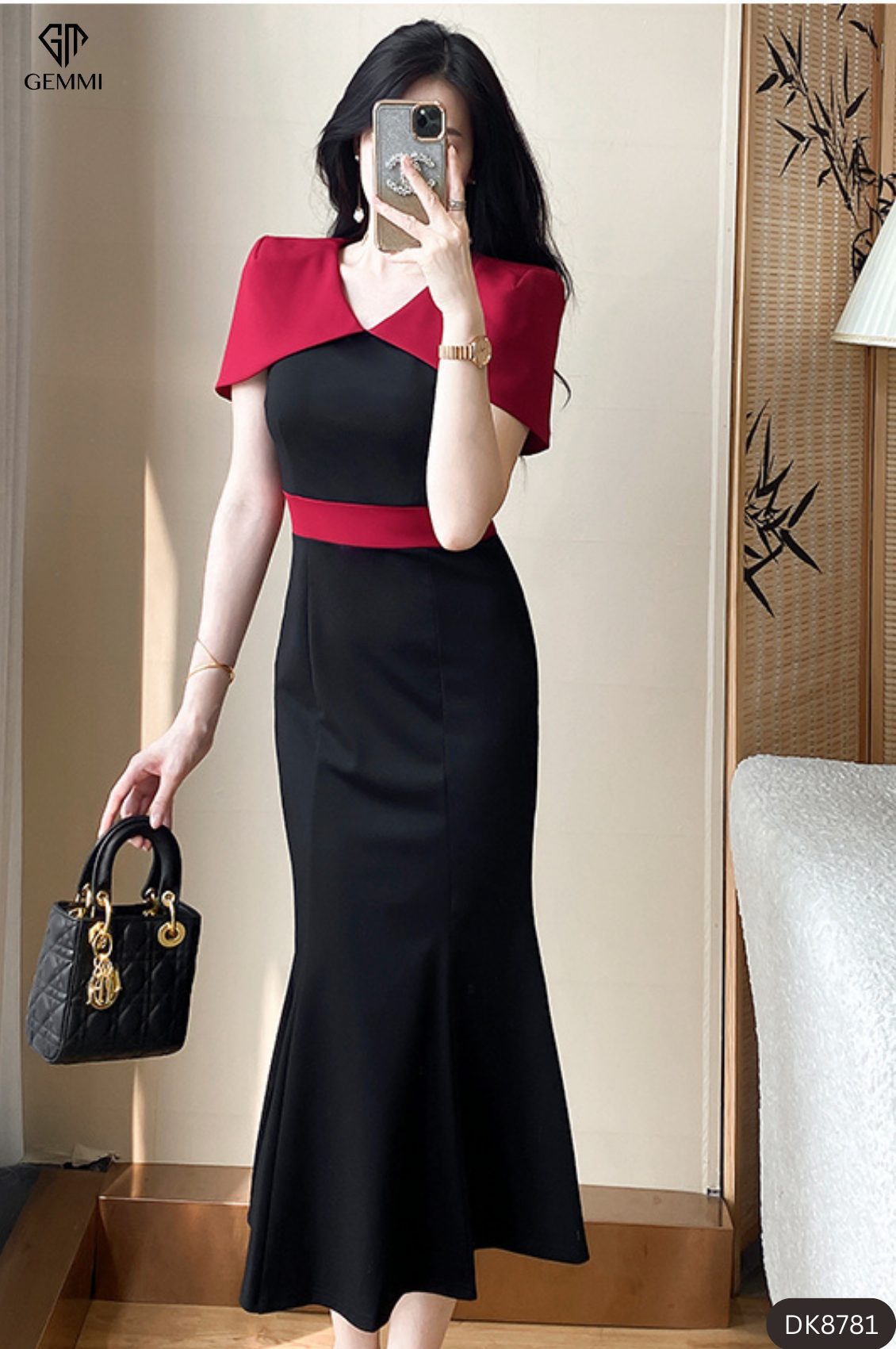 Mẫu đầm DK8781 mang phong thái sang trọng và quyền lực với phom dáng ôm dài thanh thoát, được dựng phom chuẩn mực theo trục dọc cơ thể, tạo hiệu ứng vóc dáng thon gọn và cao ráo. Thiết kế phối màu tương phản tinh tế giữa sắc đen nền nã và đỏ ruby trầm ấm được xử lý khéo léo tại phần vai, cổ chữ V và đai eo, tạo điểm nhấn thị giác sắc sảo nhưng vẫn giữ được vẻ đẹp thanh lịch.
