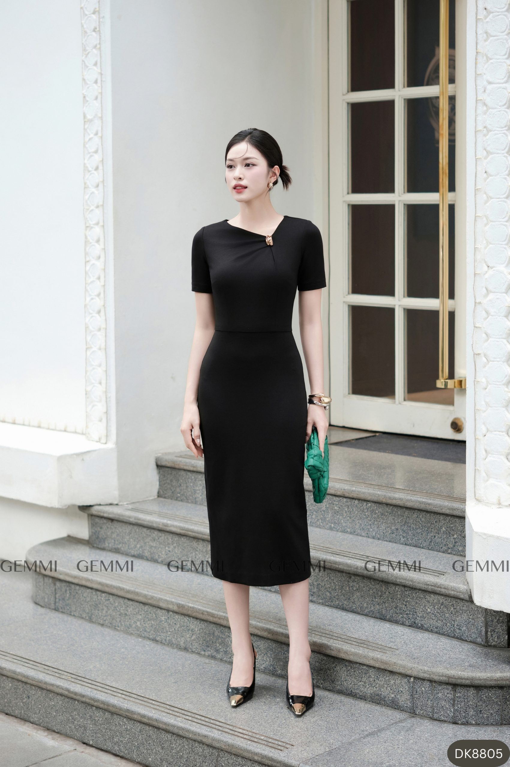 Mẫu đầm DK8805 thể hiện vẻ đẹp sang trọng và tinh tế thông qua thiết kế tối giản nhưng được xử lý chi tiết vô cùng khéo léo. Phom dáng ôm gọn theo đường cong cơ thể, tạo hiệu ứng thon gọn và thanh thoát, giúp tôn lên vóc dáng người mặc một cách tự nhiên, chuẩn mực và đầy khí chất. Phần cổ lệch nhẹ kết hợp chi tiết cài kim loại nhỏ tinh xảo tạo điểm nhấn sang trọng, vừa đủ nổi bật nhưng vẫn giữ được sự trang nhã, tinh tế cho tổng thể thiết kế.