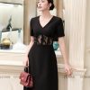 Mẫu đầm được thiết kế theo phom ôm vừa vặn, bám nhẹ theo đường cong tự nhiên của cơ thể, tạo nên sự hài hòa giữa yếu tố tôn dáng và cảm giác thoải mái khi mặc. Phần thân trên xử lý gọn gàng, cổ chữ V thanh thoát giúp mở rộng vùng cổ – vai, tôn lên nét nữ tính và khí chất sang trọng, trong khi tay áo ngắn được cắt may chuẩn mực mang lại tổng thể cân đối, trang nhã. Đặc biệt, điểm nhấn ren xuyên thấu ở phần eo được xử lý tinh tế, vừa tạo chiều sâu thị giác, vừa định hình vòng eo mềm mại, giúp vóc dáng trở nên thon gọn, cao ráo mà vẫn giữ trọn vẻ kín đáo, thanh lịch.
