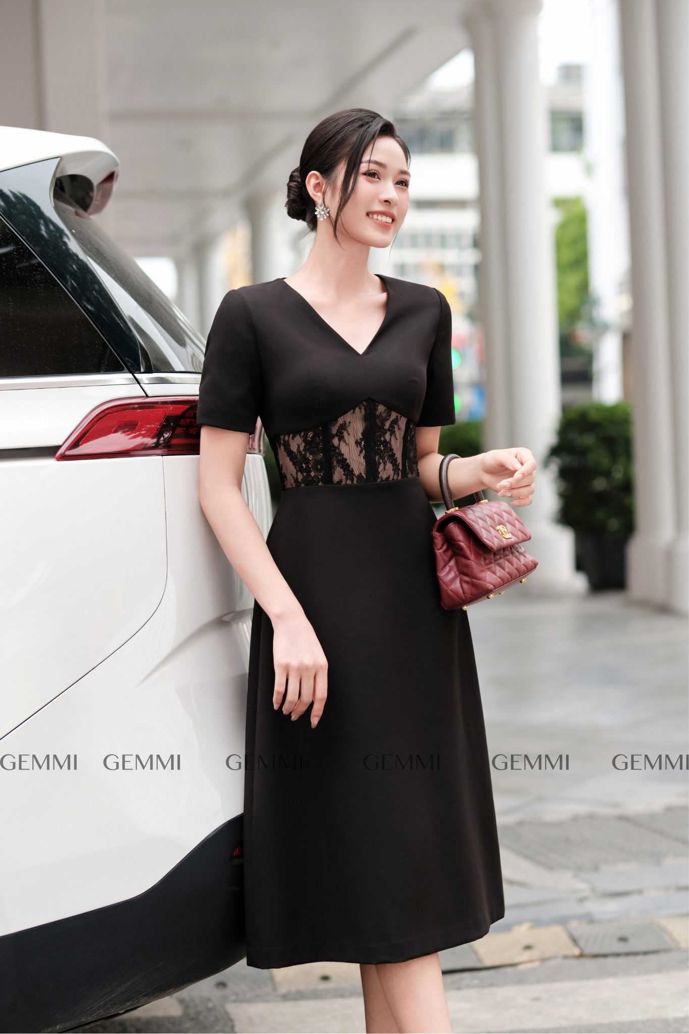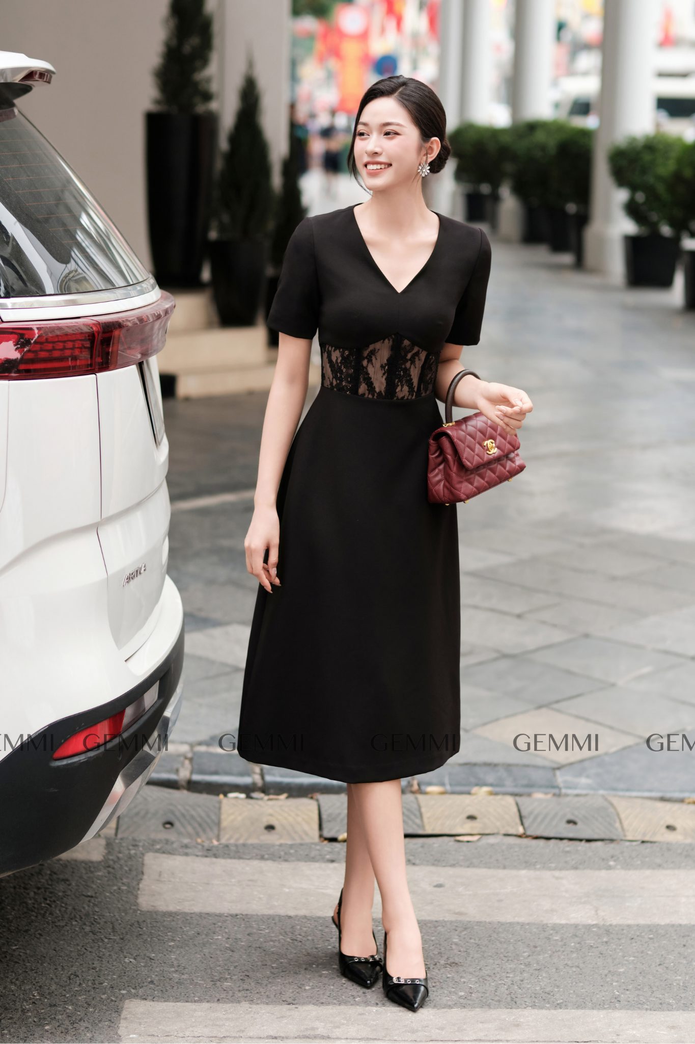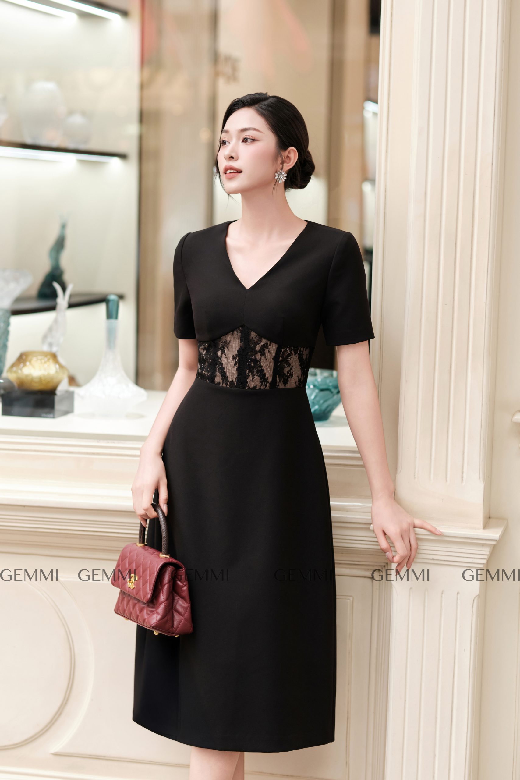 Tổng thể mẫu đầm là sự hòa quyện tinh tế giữa phom dáng ôm chuẩn mực, đường cắt cổ chữ V thanh thoát, chi tiết ren eo được xử lý nghệ thuật cùng chất liệu cao cấp và gam màu đen sang trọng làm chủ đạo. Mỗi yếu tố thiết kế đều được tính toán kỹ lưỡng, tạo nên một bố cục hài hòa, liền mạch, vừa tôn vinh đường nét hình thể, vừa mang lại hiệu ứng thị giác thon gọn, cao ráo và thanh lịch. Sự kết hợp này không chỉ tạo nên vẻ đẹp quyến rũ tinh tế mà còn thể hiện rõ chiều sâu thẩm mỹ, khí chất sang trọng và phong thái đẳng cấp của người mặc.