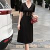 Phần cổ chữ V của mẫu đầm được xử lý tinh giản nhưng vô cùng tinh tế, với độ sâu vừa phải, tạo nên sự cân đối hài hòa giữa vẻ gợi cảm kín đáo và nét thanh lịch chuẩn mực. Đường cắt mềm mại ôm nhẹ theo khuôn cổ, khéo léo tôn lên vùng cổ cao, xương quai xanh thanh mảnh và đường nét khuôn mặt một cách tự nhiên, giúp tổng thể diện mạo trở nên sáng bừng, trang nhã mà không phô trương. Thiết kế cổ áo không chỉ mang giá trị thẩm mỹ mà còn thể hiện tư duy tạo phom chuẩn chỉnh, đề cao sự tinh tế và khí chất của người phụ nữ hiện đại.