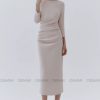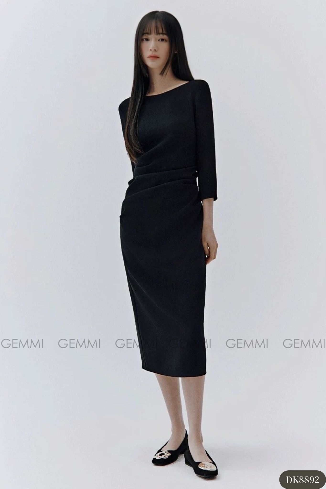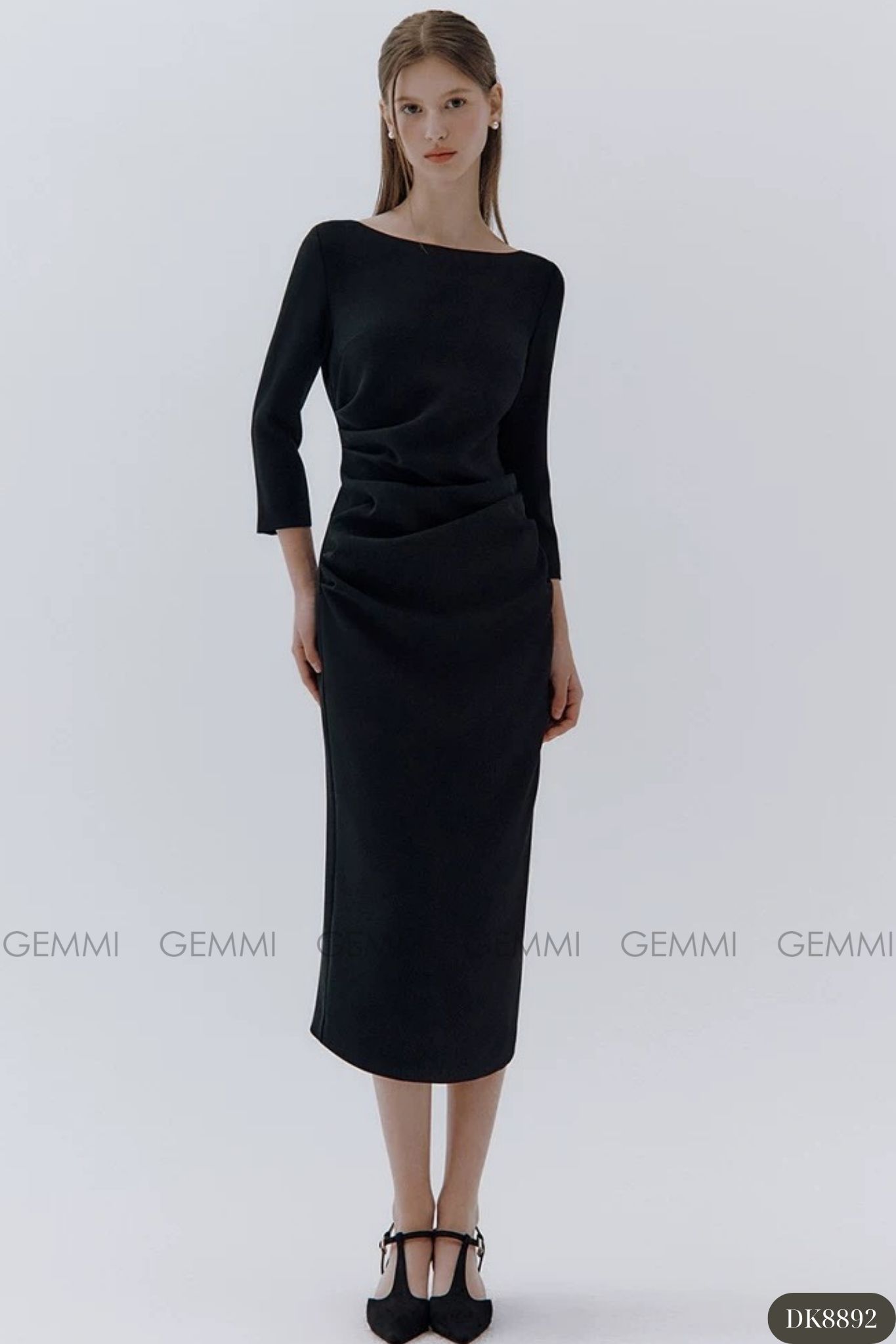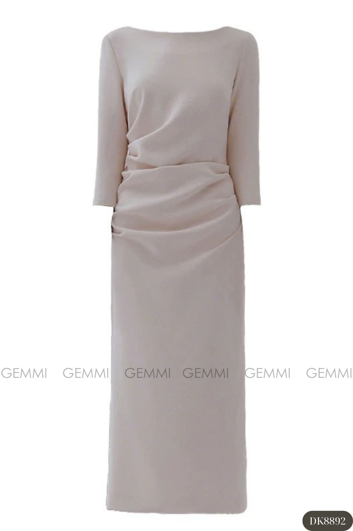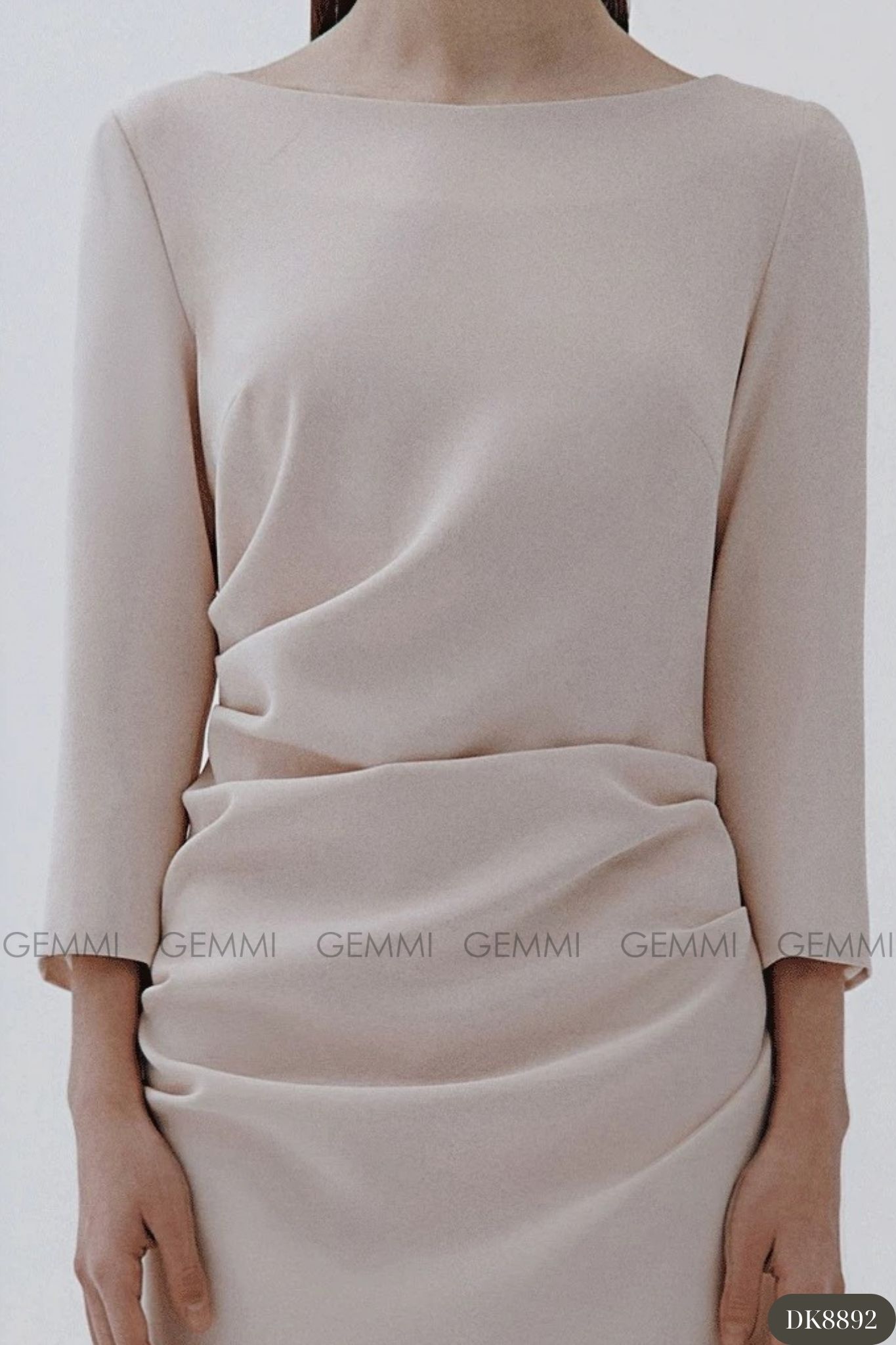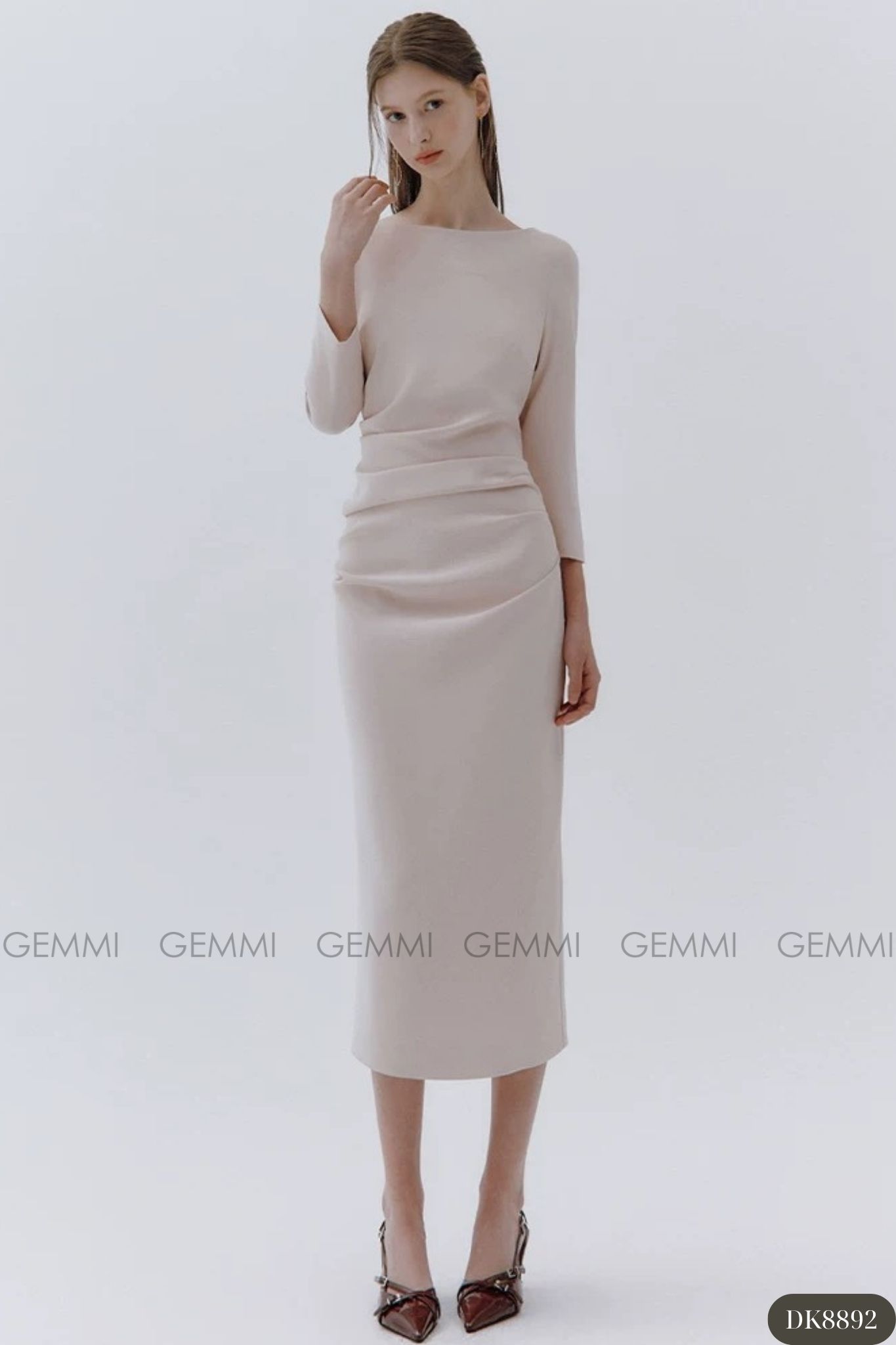 Đầm midi tay dài cổ thuyền xếp ly eo GEMMI, DK8892