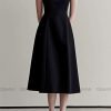 Chiều dài váy được thiết kế vượt qua gối với tỷ lệ chuẩn mực và cân đối, tạo nên sự hài hòa giữa yếu tố kín đáo, trang nhã và giá trị thẩm mỹ tinh tế. Độ dài này giúp định hình tổng thể phom dáng một cách chuẩn xác, tạo hiệu ứng thị giác kéo dài đôi chân, đồng thời giữ được sự thanh thoát và gọn gàng cho vóc dáng người mặc. Đường gấu váy được xử lý mượt mà, rủ mềm tự nhiên, giúp chuyển động trở nên uyển chuyển, nhẹ nhàng, góp phần tạo nên tổng thể mềm mại nhưng vẫn giữ được cấu trúc sang trọng, chuẩn mực.