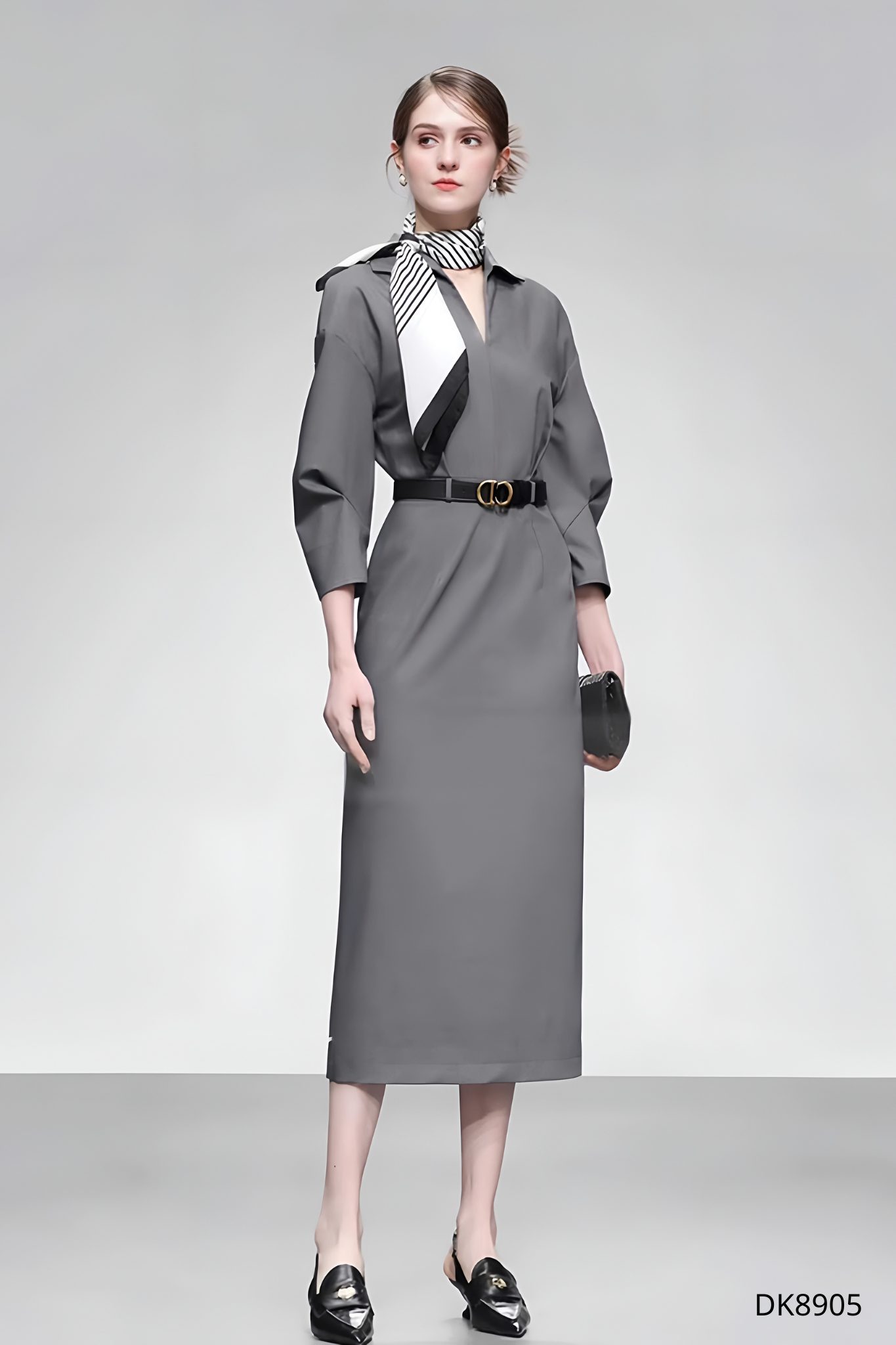 Mẫu đầm DK8905 chinh phục ánh nhìn bằng phom dáng suông dài quá gối, được tiết chế tinh tế nhằm mang đến vẻ đẹp thanh lịch, hiện đại nhưng vẫn giữ trọn khí chất sang trọng. Gam màu xám trung tính tạo nền hoàn hảo cho tổng thể trang phục, vừa nhã nhặn vừa tôn lên phong thái điềm đạm và đẳng cấp của người mặc. Thiết kế cổ mở nhẹ kết hợp chi tiết phối mảng tinh tế ở phần thân trên, cùng khăn cổ được xử lý hài hòa, tạo điểm nhấn thị giác mềm mại và khác biệt.