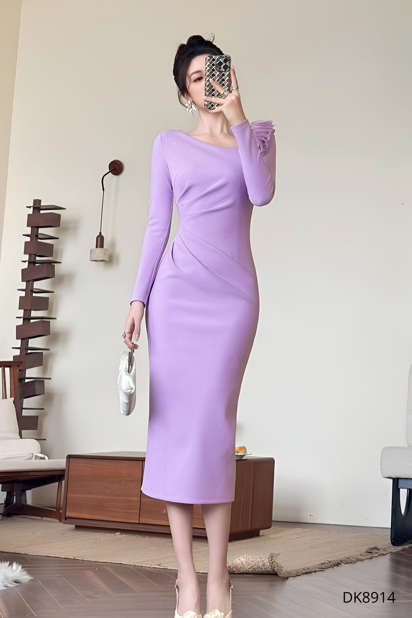 Phần tay dài của mẫu đầm DK8914 được thiết kế ôm vừa phải theo đường cong cánh tay, tạo cảm giác gọn gàng mà không hề bó cứng hay gây khó chịu khi mặc. Kiểu tay này giúp che khéo léo các khuyết điểm thường gặp như bắp tay to, da không đều màu hoặc vùng tay kém săn chắc, nhờ đó cánh tay trông thon dài, mượt mà và thanh thoát hơn rõ rệt khi nhìn tổng thể.