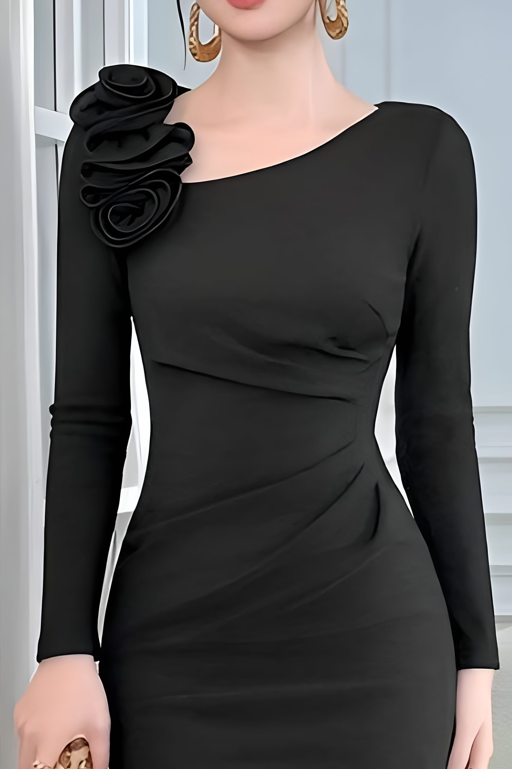Điểm nhấn hoa vải 3D được đặt nổi bật trên vai không chỉ đóng vai trò trang trí mà còn là chi tiết “couture” đắt giá, giúp nâng tầm toàn bộ thiết kế. Cụm hoa được tạo hình có chiều sâu, tạo hiệu ứng thị giác sang trọng, đồng thời làm phần vai trông đầy đặn và cân đối hơn, đặc biệt phù hợp với những người có bờ vai nhỏ hoặc thân trên mảnh.