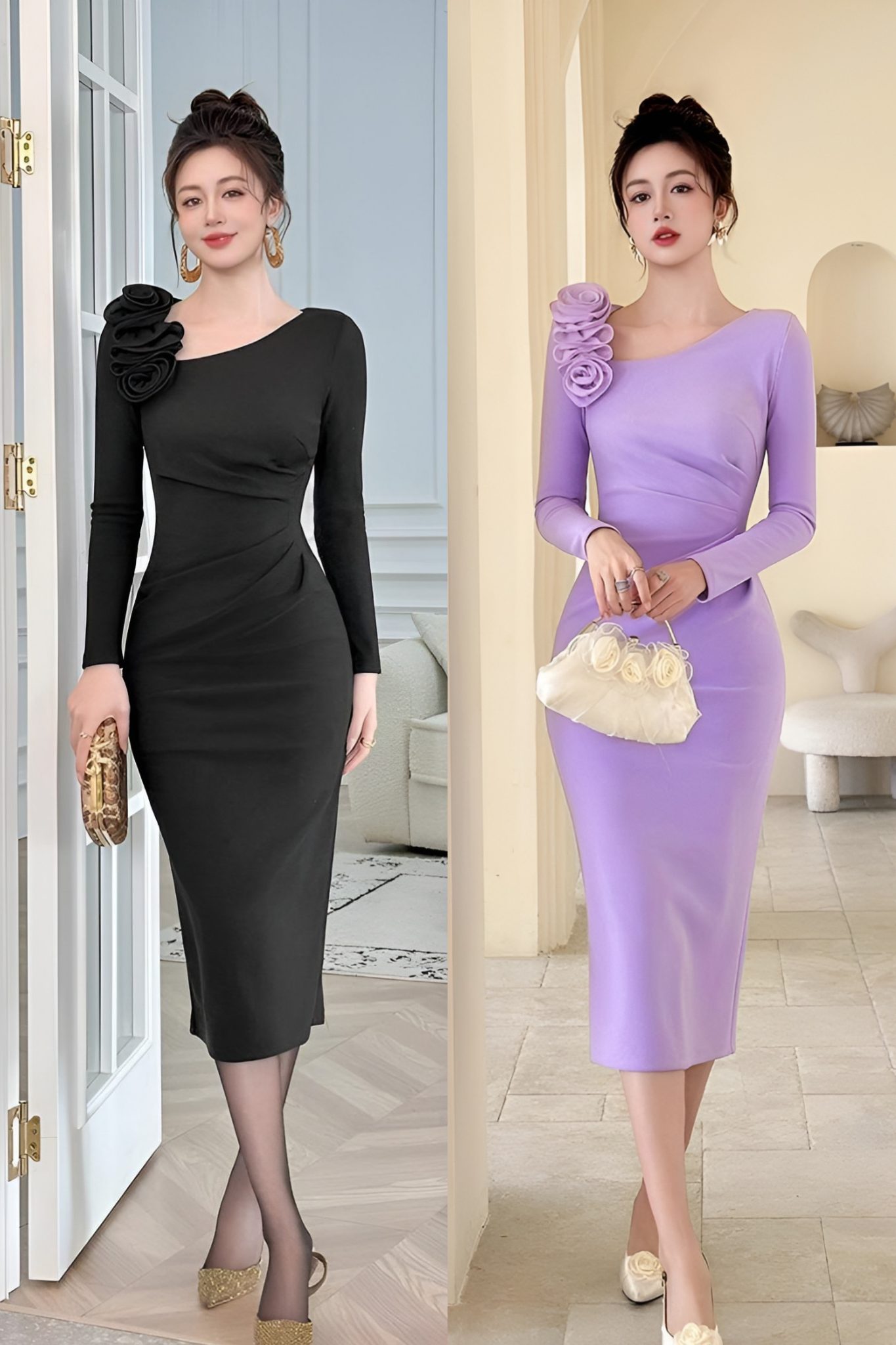 Bên cạnh hiệu quả tôn dáng, tay dài còn góp phần giữ cho chiếc đầm một vẻ đẹp kín đáo, chuẩn mực và rất “high-end”. Chính sự tiết chế này làm cho thiết kế trở nên linh hoạt hơn, dễ dàng phù hợp từ những buổi tiệc tối sang trọng đến các dịp tiếp khách, gặp gỡ đối tác hay sự kiện cao cấp, nơi người mặc cần một hình ảnh vừa nữ tính, vừa tinh tế và đầy khí chất.
