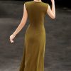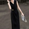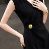 Đồng thời, điểm nhấn nơi phần eo còn mang lại chiều sâu cho tổng thể trang phục, giúp chiếc đầm thoát khỏi cảm giác đơn điệu mà vẫn giữ vững tinh thần tối giản cao cấp. Sự kết hợp giữa đường cắt mềm mại và chi tiết ánh kim tạo nên hiệu ứng hài hòa, vừa đủ để thu hút ánh nhìn mà không làm mất đi sự thanh lịch vốn có. Đây chính là yếu tố tinh tế giúp thiết kế trở nên khác biệt, phù hợp với người phụ nữ yêu thích vẻ đẹp sang trọng được thể hiện qua những chi tiết nhỏ nhưng giàu giá trị.