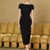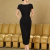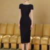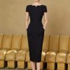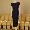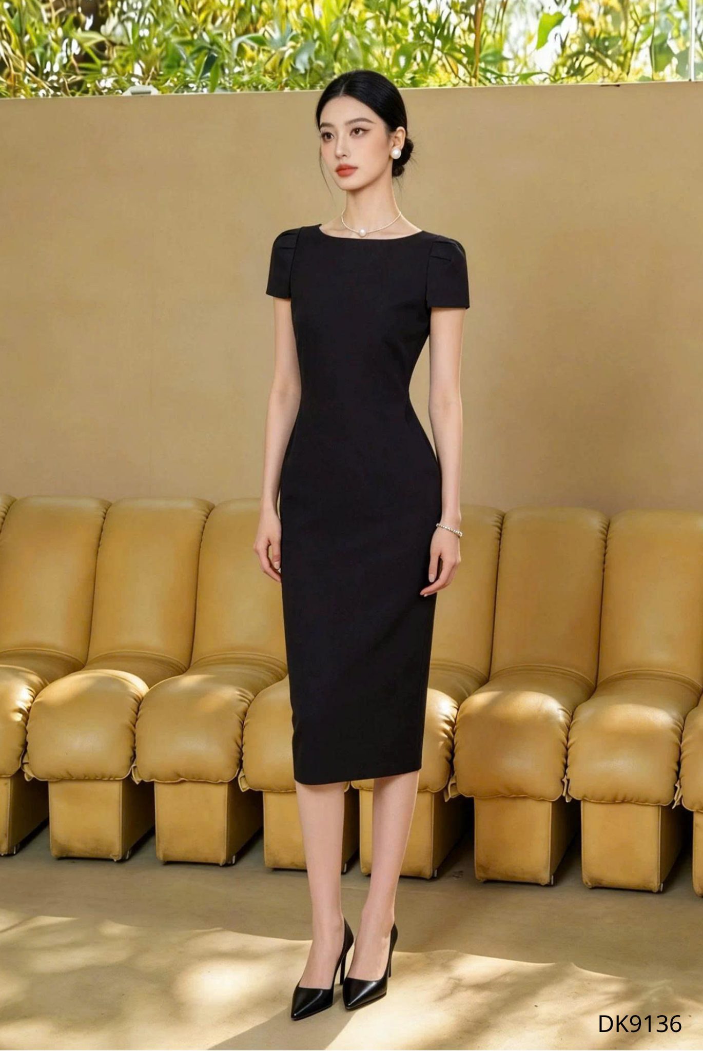 Mẫu đầm ôm dáng được thiết kế theo tinh thần tối giản cao cấp, tôn vinh trọn vẹn đường nét cơ thể một cách tinh tế và đầy chủ đích. Phom dáng bút chì chuẩn mực ôm gọn từ phần vai xuống eo và hông, tạo nên hiệu ứng thị giác thanh thoát, giúp vóc dáng trở nên cân đối và thon gọn hơn. Phần tay ngắn được xử lý gọn gàng, mang lại cảm giác trang nhã nhưng vẫn đủ kín đáo để phù hợp trong nhiều bối cảnh, từ môi trường công sở đến những buổi gặp gỡ trang trọng. Thiết kế cổ tròn thanh lịch kết hợp cùng chi tiết phụ kiện nhỏ tại trung tâm giúp tạo điểm nhấn nhẹ nhàng, tăng chiều sâu cho tổng thể mà không làm mất đi sự tinh giản vốn có.