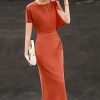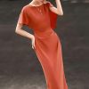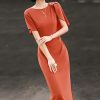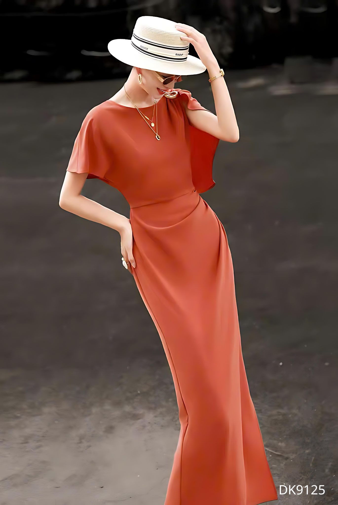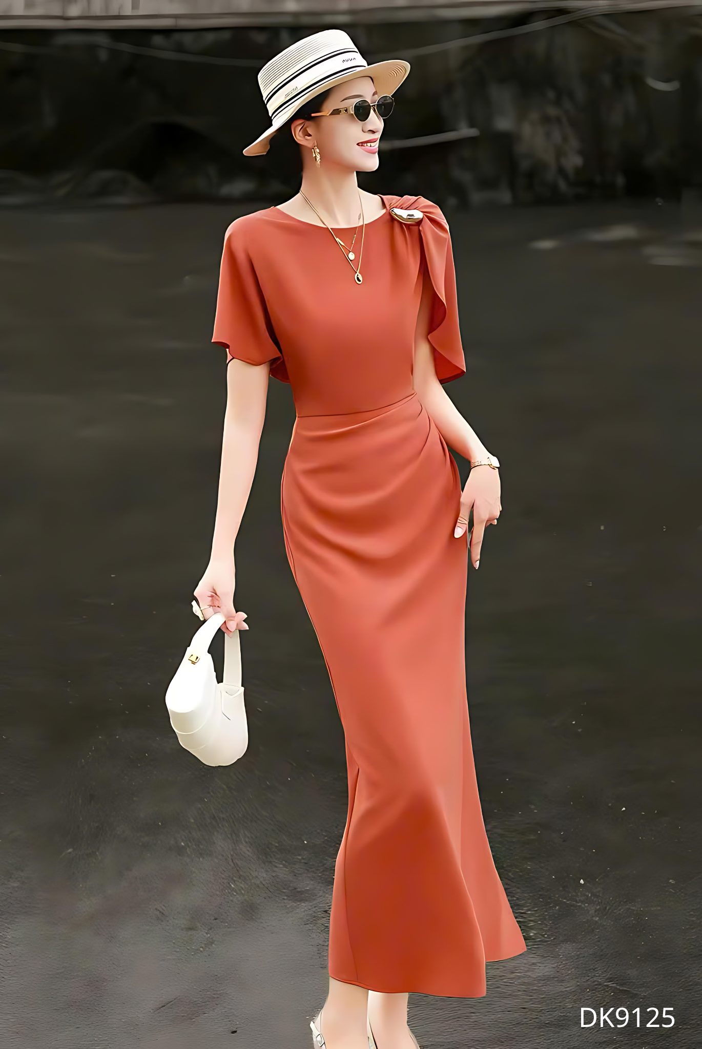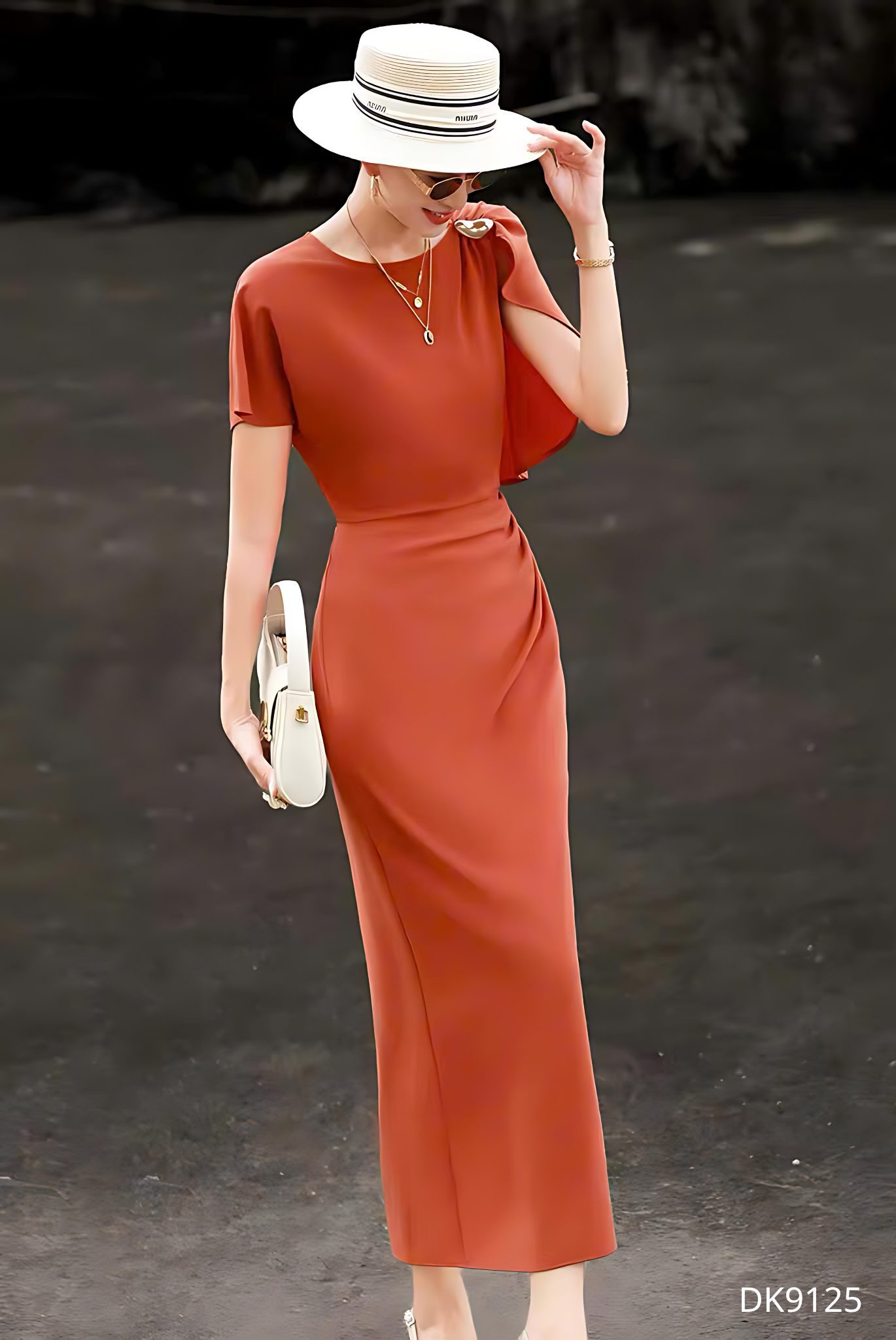 Mẫu đầm DK9215 gây ấn tượng ngay từ ánh nhìn đầu tiên bởi sắc đỏ cam trầm ấm – gam màu vừa rực rỡ vừa tinh tế, tôn lên làn da và khí chất người mặc một cách đầy cuốn hút. Thiết kế ôm nhẹ theo đường cong cơ thể, khéo léo nhấn vào vòng eo thanh mảnh, tạo nên phom dáng thon gọn và thanh thoát. Phần tay ngắn được xử lý bất đối xứng với lớp vải buông rủ mềm mại, mang lại chuyển động uyển chuyển và điểm nhấn thị giác đầy nghệ thuật.